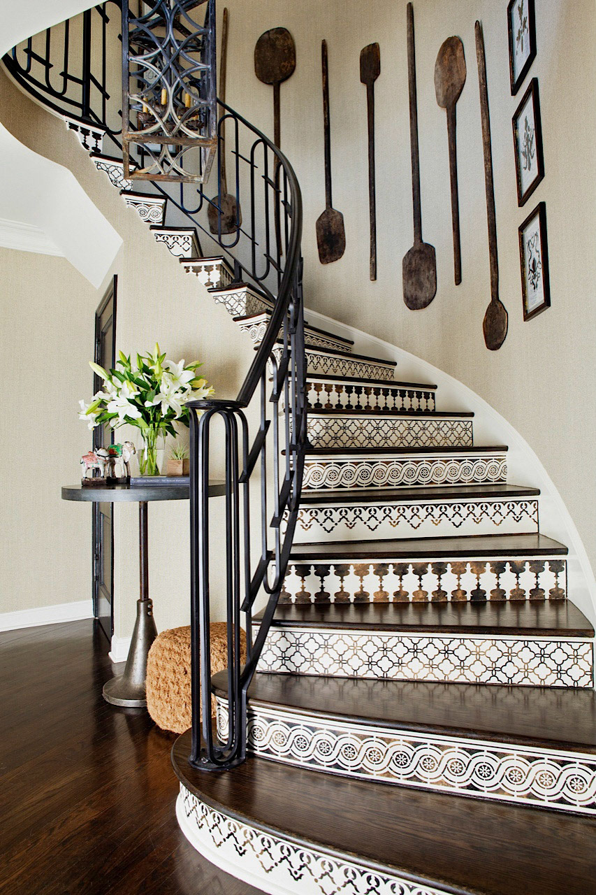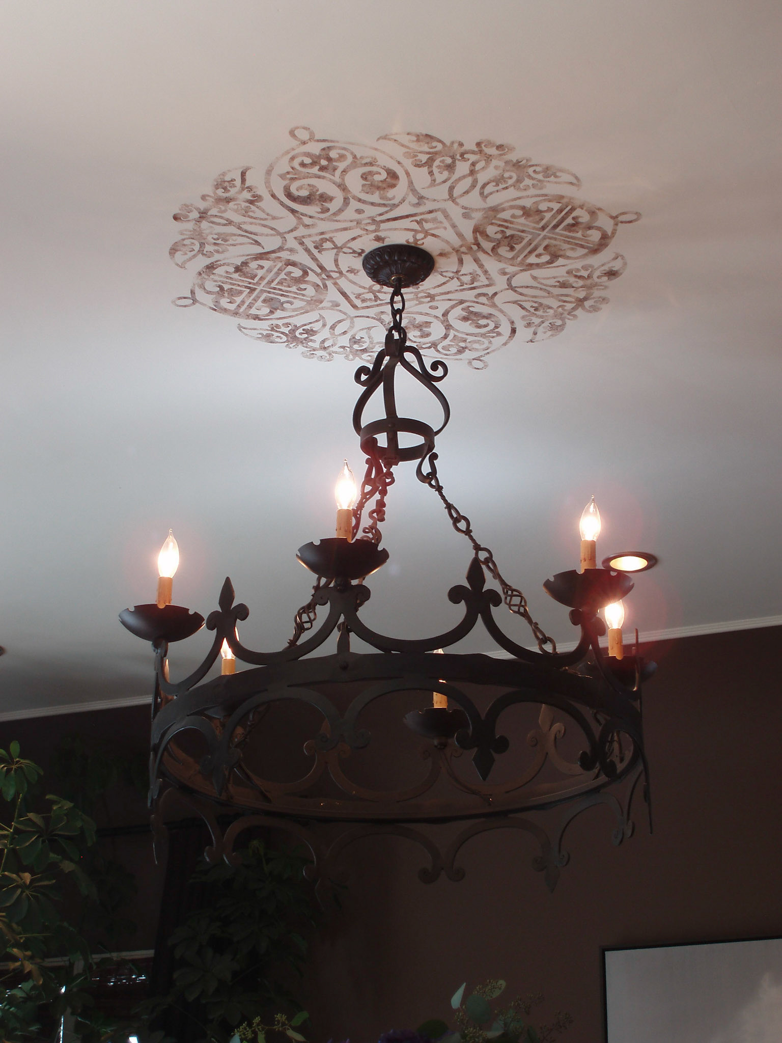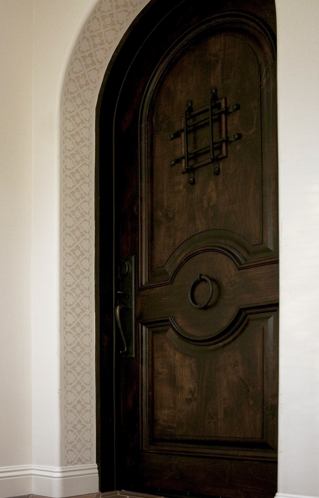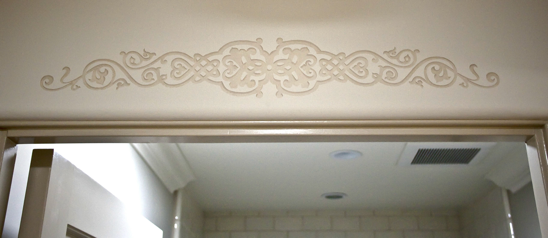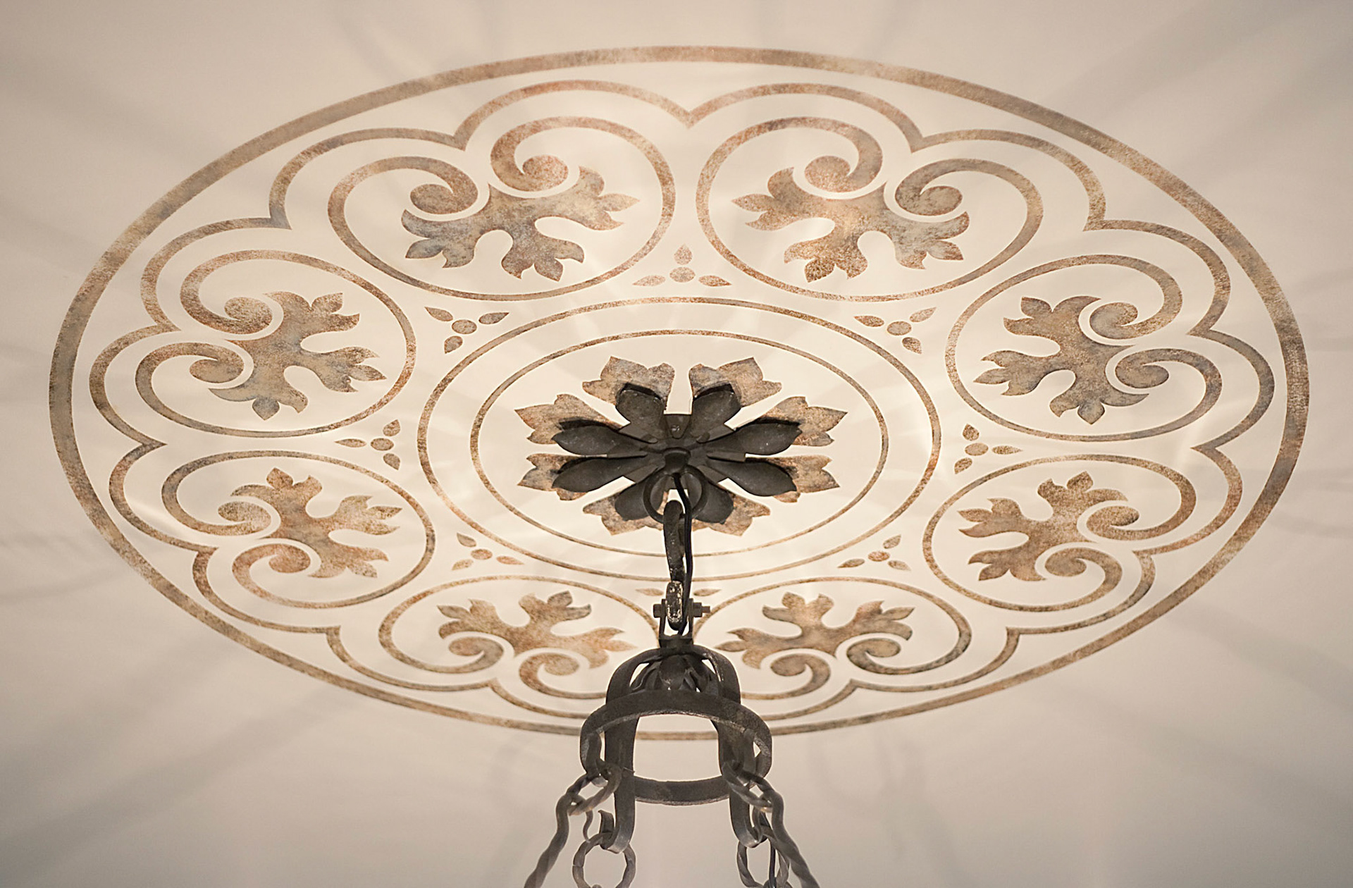 Ceiling medallions, stenciled staircase risers, archways and window frames are a few of the ways Brown Design, Inc. adds unique touches to their refined interiors.